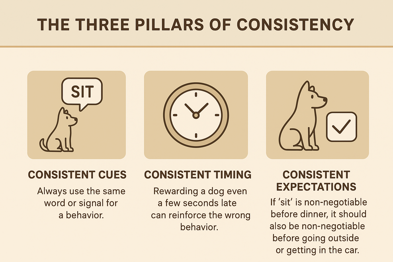 Dogs learn through repetition, patterns, and predictable outcomes.